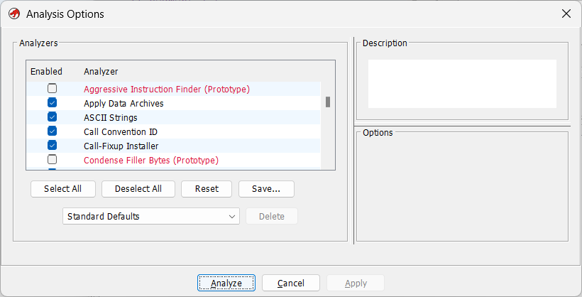 soit en double-cliquant sur l’exécutable login2.Ghidra propose alors de lancer son analyse avec ensemble d’options paramétrables.