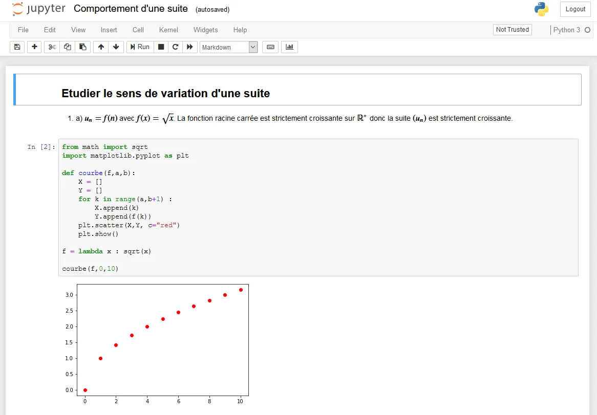Présentation et Mise en place de l’environnement de développement Fiche d’activité Objectifs À l’issue de cette activité, vous devez être capable de … : installer Miniconda c.-à-d. l’environnement minimal de développement de la distribution Python nommée Anaconda créer et manipuler des environnements virtuels de développement Python installer des paquets Python saisir et exécuter du code Python dans un notebook Jupyter Compétences du référentiel abordées Domaine Compétence C4. Réaliser C4.3: installer et configurer une chaîne de développement C4.4: développer un module logiciel C4.5: tester et valider un module logiciel Savoirs du référentiel abordés Savoir Description: S4 Développement logiciel S4.1 Principes de base S4.2 Algorithmique S4.7 Langages de programmation Conditions Durée : 1h Travail individuel Compte rendu : <néant> Ressources Matériel(s) : PC Windows 10 64bits Logiciel(s) : Installateur Miniconda Documentation : Liens Python Pré-requis Bases sur la programmation Présentation générale du langage 🖮 Travail n° 1 Survol du langage La connaissance du langage Python n’est pas requise pour cette activité qui est guidée. Néanmoins, pour avoir une vue d’ensemble du langage, survoler (durée : 15 minutes max.) les 2 premiers tutoriels donnés en lien dans Tutoriels généraux sur le langage Python. Environnement de développement Généralités Avant d’installer Python sur sa machine, on doit se poser 3 questions : Quelle version ? → Étant donné que la force de Python repose en partie sur la multitude de bibliothèques tierces proposées et que le langage est en perpétuelle évolution, il peut être plus prudent de ne pas choisir la toute dernière version de l’interpréteur Python de façon à s’assurer qu’il soit compatible avec les bibliothèques nécessaires au projet qu’on souhaite développer. Par exemple, même si c’est plus rare aujourd’hui, certaines bibliothèques ne sont compatibles qu’avec la version 2.x de Python alors que sa version 3 est disponible depuis 2008 (cette version a effectivement “cassé” la compatibilité avec les versions antérieures suite à de profonds changements) Quelle architecture (32 ou 64 bits) ? → La version 64 bits est bien sûr plus performante que la 32 bits sur un système d’exploitation 64 bits. Cependant, comme Python est parfois utilisé en tant que langage de script intégré par certains logiciels (ex.: éditeur de texte Vim), sa version devra donc correspondre à l’architecture adopté par le logiciel en question. Cependant, il est tout à fait autorisé d’avoir plusieurs versions de Python installées sur la machine et il n’est d’ailleurs pas rare qu’un logiciel nécessitant Python dans une version particulière l’intègre dans son installateur (ex. : FreeCAD - logiciel de modélisation 3D). Quelle distribution ? → Tout comme le système d’exploitation Linux, il existe plusieurs distributions de Python basées sur l’implémentation standard de la Python Software Fundation (→ CPython). L’installation de la version standard suffit la plupart du temps lorsqu’on désire apprendre le langage Python. Cependant d’autres distributions (Anaconda, ActivePython, Enthougth’s, WinPython …) offrent, dès l’installation, des fonctionnalités supplémentaires intéressantes dans un contexte professionnel. Dans la suite, on utilisera la distribution Miniconda dans son édition Windows 64 bits Miniconda Miniconda se définit sur son site comme un installateur minimal gratuit pour le gestionnaire de paquets et d’environnements virtuels nommé conda. Si on omet la fonctionnalité de gestion d’environnements virtuels (voir plus loin), conda peut être assimilé aux gestionnaires de paquets rpm ou apt sur Linux, homebrew sur Mac, chocolatey sur Windows. Miniconda est une version minimale d’une autre distribution Python bien connue appelée Anaconda. À ce titre, elle n’inclut que l’outil d’administration conda, l’interpréteur Python, les paquets dont ils dépendent et enfin un nombre restreint de paquets utiles, comme pip, zlib et quelques autres (à la différence d'Anaconda qui installe par défaut environ 250 paquets et qui occupe près de 3Go sur le disque dur !). Une fois Miniconda installé, il suffit d’utiliser la commande conda install pour installer les paquets supplémentaires dont on a vraiment besoin parmi la multitude de paquets que propose le dépôt officiel d'Anaconda ainsi que le dépôt communautaire Conda Forge . Comme indiqué plus haut, conda permet, outre la fonctionnalité de gestionnaire de paquets, l’utilisation d’environnements virtuels Python. L’objectif d’un environnement virtuel est de permettre d’isoler une version de Python et les bibliothèques utilisées dans le cadre d’un projet. Ainsi, on peut : utiliser n’importe quelle version de Python pour un environnement spécifique sans avoir à se soucier des collisions avec une autre version de Python installée ailleurs connaître exactement les noms et les versions des paquets requis pour exécuter notre code. Ceci, dans le cas où quelqu’un d’autre souhaiterait l’exécuter sur sa propre machine. éviter d’inonder notre répertoire principal de paquets Python inutiles. Quelques commandes utiles conda create -n name python ou conda create --name name python Crée un nouvel environnement nommé name possédant la dernière version de Python conda create -n name python=2.7.18 Crée un nouvel environnement nommé name possédant la version 2.7.18 de Python conda env list Listes les environnement présents sur la machine conda search package Recherche le paquet package dans le “canal” standard (équivalent d’un dépôt) conda install -c channel package=version Installe dans l’environnement courant le paquet package dans sa version version depuis le “canal” channel Ex. : conda install -c conda-forge notebook=6.3.0 conda l